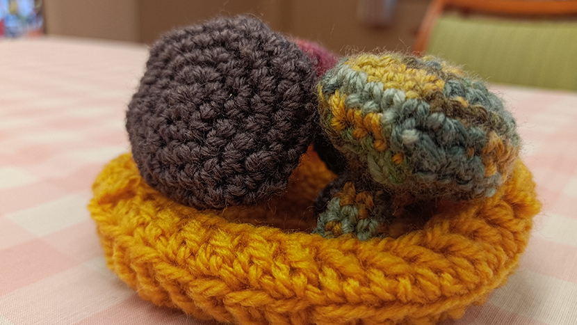 担当の職員お手製のきのこの編み物を卓上に飾り、秋らしさを感じます。「これは手づくりなの?上手ね」と話題にもなりました(*‘∀‘)